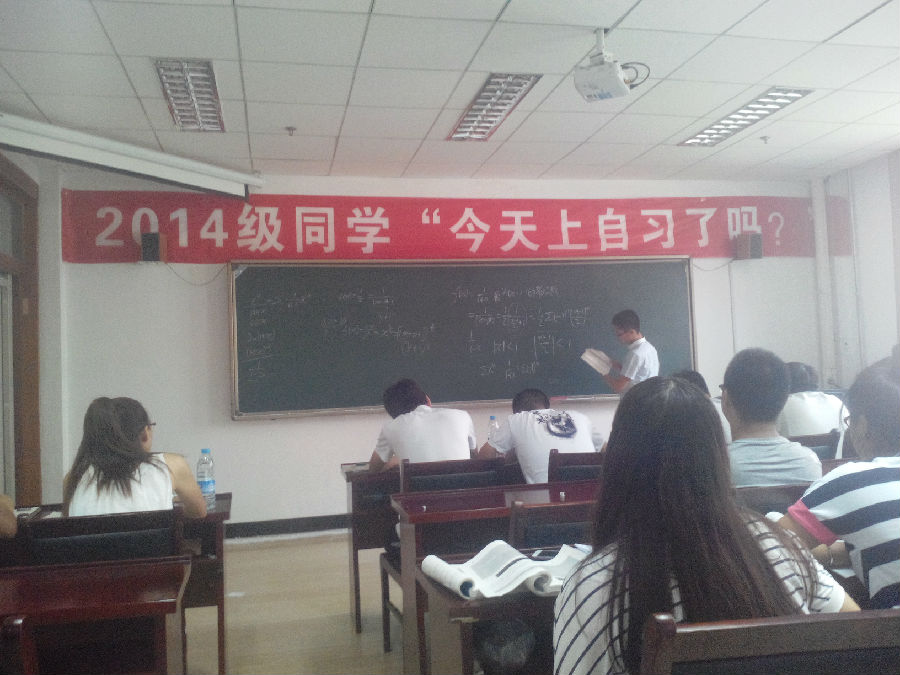 步入教室,“2014级同学,今天你上自习了么?”醒目的标语映入眼帘。你问我答、奋笔疾书、认真思考、互帮互助的一幕幕场景尽在眼底。这正是万象城为加强2014级新生班级学风建设,提升后进生学习成绩的一项新举措——开设数分、高代学习提高班。学院用爱温暖学生,通过队伍搭建、制度设计、文化熏陶,努力营造良好的班风学风。利用短学期空隙,组织三个专业学习成绩差的学生上自习,学习成绩好的同学作为“小老师”授课。