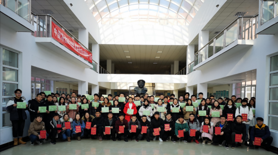 部分获奖学生在阳光大厅铁人像前留念