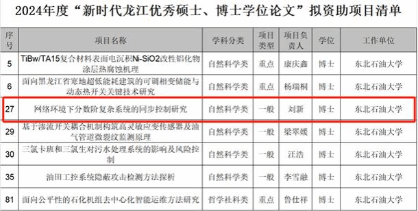 (通讯员 王美娜)近日,黑龙江省教育厅正式公示了2024年度"新时代龙江优秀硕士、博士学位论文"拟资助项目名单。经严格评审,万象城7位学者脱颖而出获得资助,其中万象城刘新老师的博士论文《网络环境下分数阶复杂系统的同步控制研究》成功获批自然科学类一般项目资助。